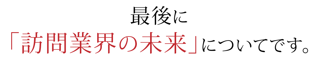 情報社会やテクノロジー、オンラインでは解決できないことがまだまだ訪問業界にはあるし、それを最も必要としてくれている方々が大勢いて、彼らと手を組むのです。