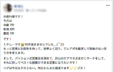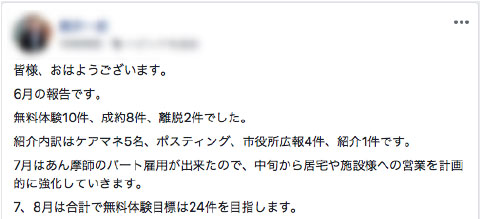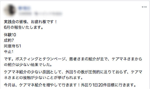『今まで平均2件の新規紹介しか無かったんですが、関わってわずか1か月で新規紹介7件を実現できました!ケアマネ営業に悩んでいるなら実践会は本当にオススメです!』