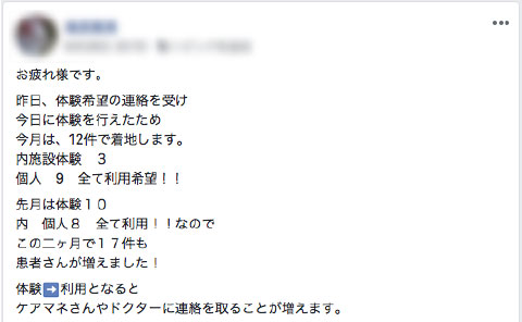 また、全国で一番保険請求が厳しいと言われる商圏で、営業開始後数カ月でケアマネ紹介単月20件以上と、驚異的な数字を叩き出し、