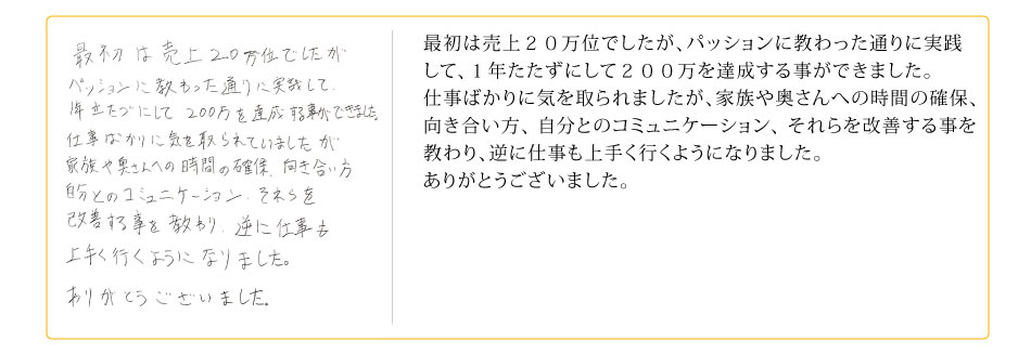 『売上0から初めて実践会に関わりパッション式営業法で10件の無料体験をゲットでき、開業1ヶ月で売上30万アップを実現できました!また雇用の仕方や教育のやり方も学べて助かってます!』
